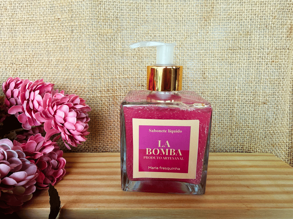 Vidro 250 ml com sabonete líquido hidratante. Fragância do perfume La Bomba