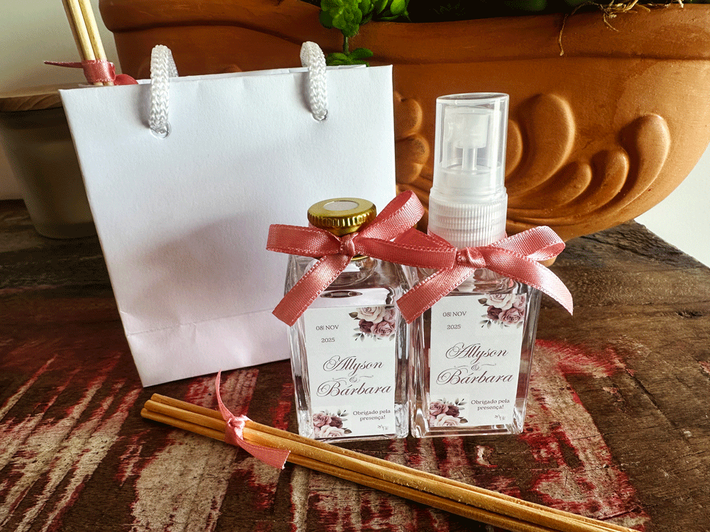 Dupla de vidros 35 ml com difusor de aroma por caretas e home spray. Em sacolinha prontinho pra presentear. Rotulos e fragrância personalizados. whatsapp (11) 99195-1313
